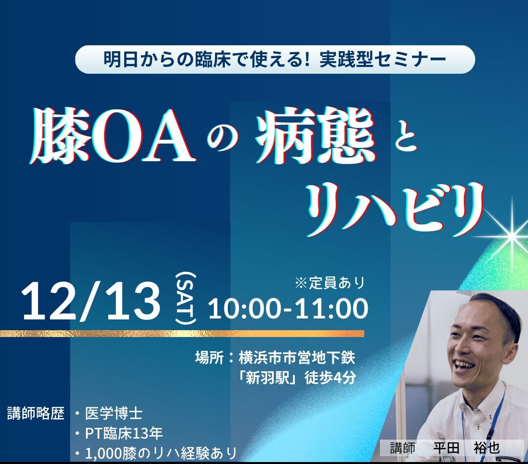 | イベント名 | 膝OAの病態とリハビリ ~ 明日から臨床で使える!実践型セミナー ~ |